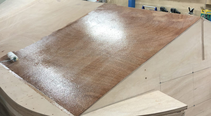 Tijd voor huidlaag nummer 2. De 2 de huidlaag word op de 1 ste huidlaag verlijmd en tijdelijk vast gezet met schroeven.